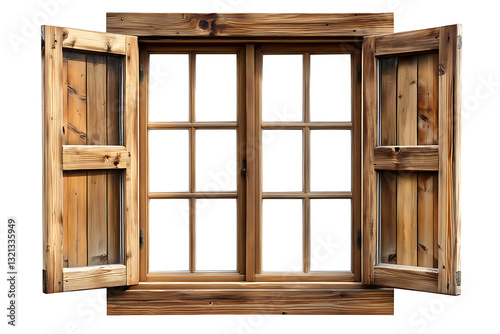 Window of Rustic Charm: A close-up view of a rustic wooden window, its shutters open, revealing a glimpse of the outside world, exudes warmth and simplicity.