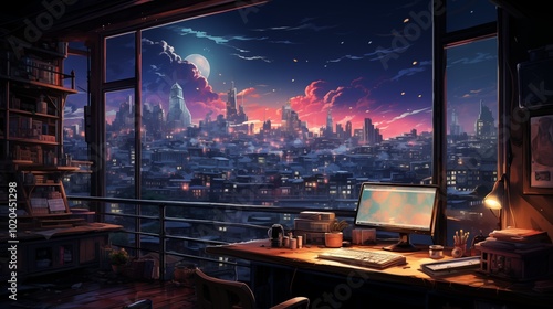 Window view of a city at night. Lofi, anime, manga style. Desk to study. Chill, cozy, comfortable room. Messy place. Relaxed colorful appartment, tranquil digital painting. 4k wallpaper, background.