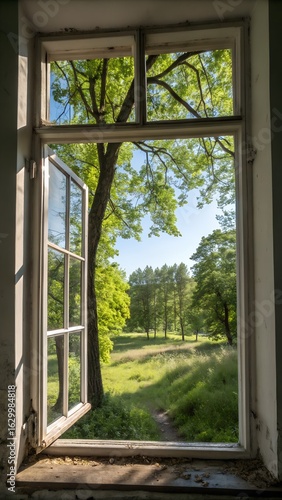 window with a summer forest view. sunny day. fresh air from the park trees