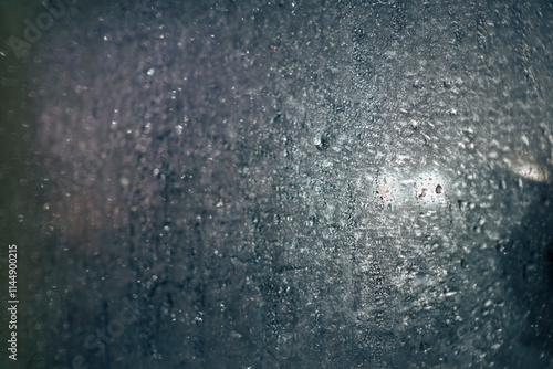 window with waterdrops and dew. Car lights through the window