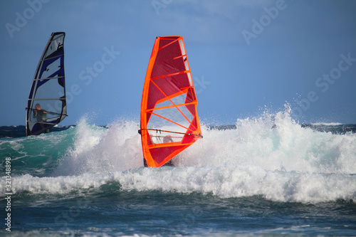 Windsurfers among breaking ocean waves