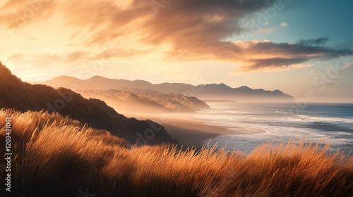 Windswept Coastal Cliffs with Rugged Flora and Ocean Waves Below, Captivating Seascape of Nature's Untamed Beauty
