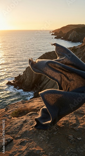 Windswept Scarf on Coastal Cliff at Sunset, Golden Hour Glow