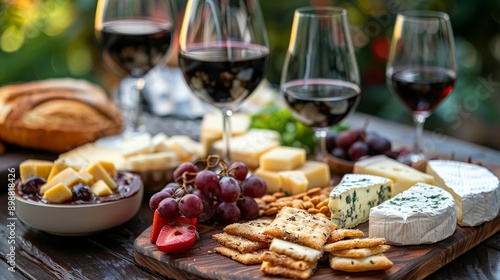Wine and cheese pairing with fresh snacks in a relaxing outdoor setting