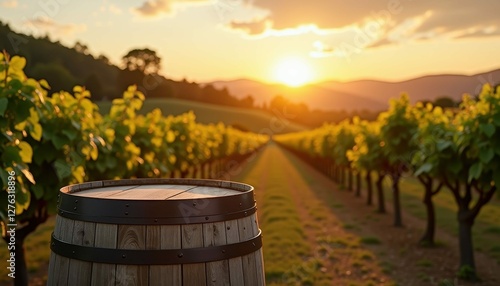 Wine Barrel Centerpiece Amidst Serene Vineyard Landscape at Dusk with Golden Sunlit Horizon