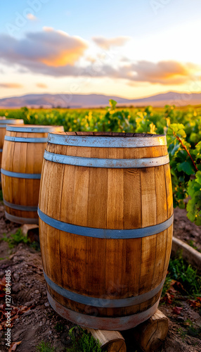 Wine barrels in vineyard row at sunset for winemaking or tourism illustration