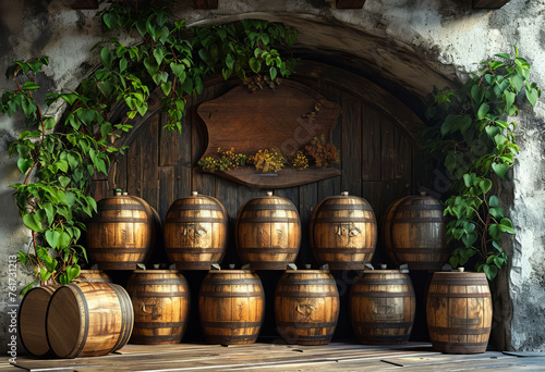 Wine barrels stacked in the cellar of the winery