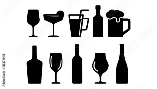 Wine bottle and glasses silhouette icon set. alcoholic beverages vector outline signs