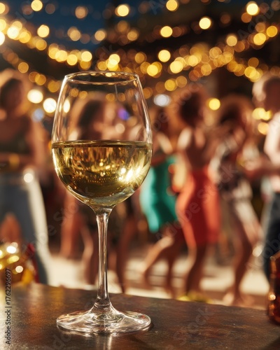 Wine glass close up at outdoor party with dancing people and festive string lights celebration of summer night life