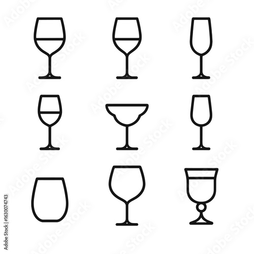 Wine Glass Icon Set. Outline icon set of wine glass types: red wine glass, white wine glass, champagne flute, rosé glass,