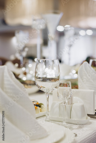 Wine glasses and glasses on the server table.Luxurious elegant dinner at the table in the restaurant. Holiday table decoration