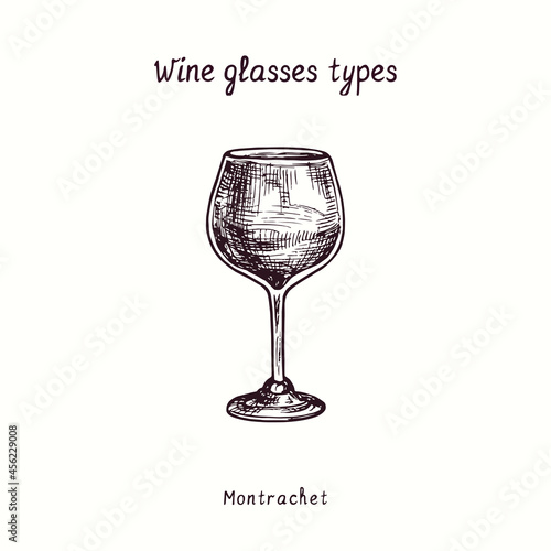 Wine glasses types collection, Montrachet. Ink black and white doodle drawing in woodcut style.