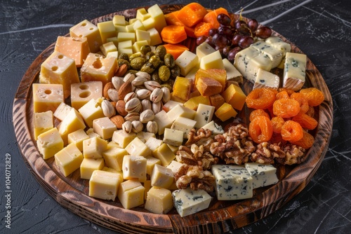 Wine Plates, Cheeseboard, Cheese Mix, Dried Fruits and Nuts. Various Cheese Pieces, Diced Cheddar