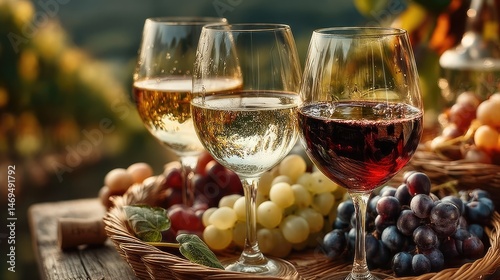 Wine tasting experience with glasses and vineyard backdrop in beautiful nature setting