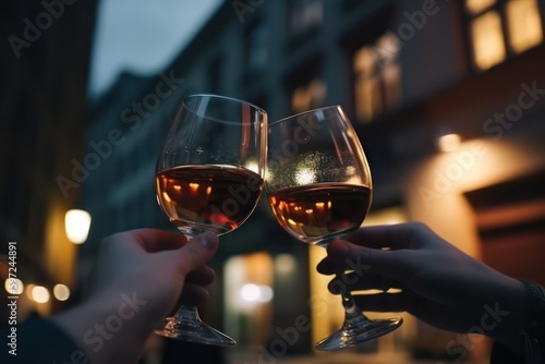 Wineglasses in couple hands close up, woman and man drinking and toasting in a outdoors bar. Generative AI