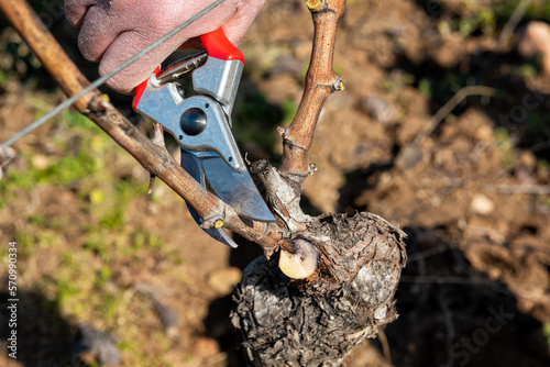 Winegrower pruning the vineyard with professional steel scissors. Traditional agriculture. Winter pruning, Guyot method.