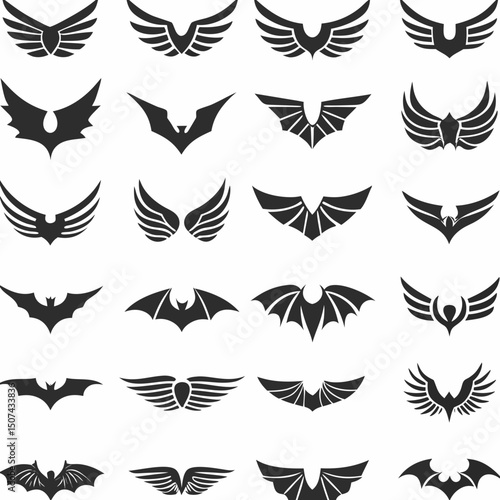 Wing logo designs, vector wing set. Artistic wing illustrations including eagle, angel, bird, bat, and minimalist icons for tattoos, emblems, branding, or fantasy-themed projects.