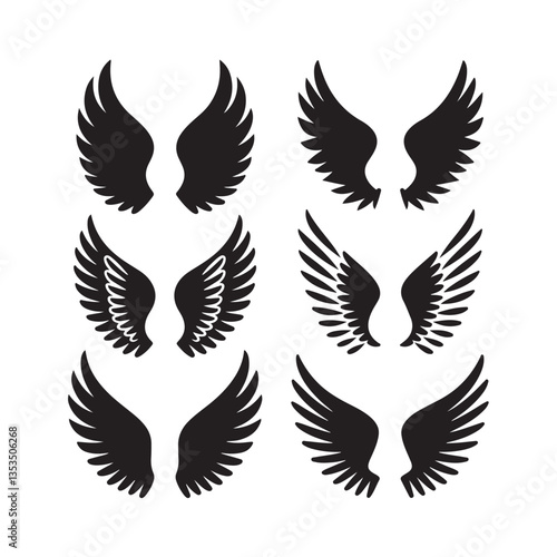 Wings Icon Set. Collection of black wing designs featuring various styles, including bird wings and angel wings. Diverse wing shapes ideal for logos, emblems, or decorative elements. Vector