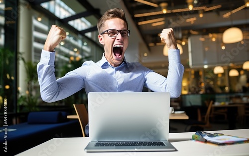Winner businessman with online sale, email announcement of promotion or bonus success. Excited corporate person with fist pump for office celebration, salary increase or target. Generative AI