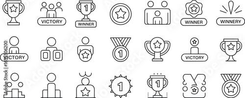 Winner trophy outline, victory medal icons, champion award symbols, competition success badges, sports achievement prizes, flat vector illustration icons