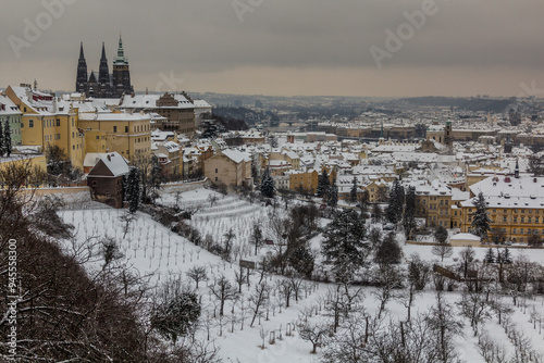 Winter aerial view of Prague castle and Mala strana (Lesser quartier) in Prague, Czech Republic
