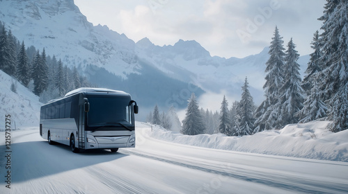 Winter Bus Journey Through Snowy Mountain Landscape With Scenic Views
