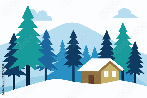 Winter Cabin in Snowy Forest Landscape with Evergreen Trees and Mountain Backdrop Illustration
