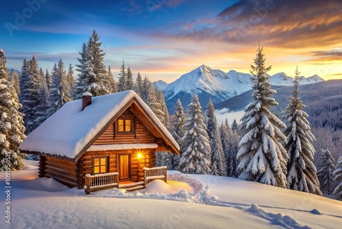 Winter cabin nestled in snow landscape with trees and mountains in the background