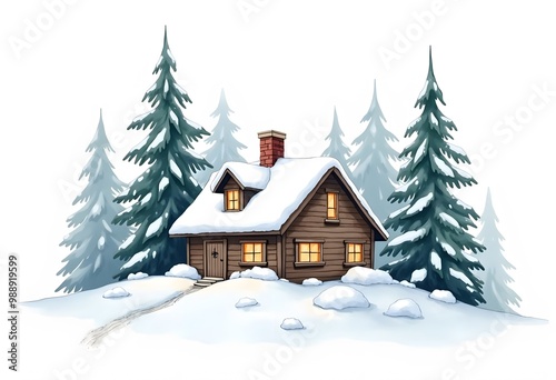 Winter Christmas landscape with country house, snow and trees isolated on white background. Watercolor hand drawn illustration