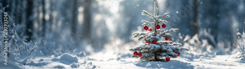 Winter Christmas Tree in Snow, Snowflakes Falling, Festive Holiday Scene