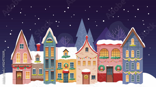 Winter cityscape with Scandinavian style houses. Cute snowy houses with garlands and lanterns. Vector Christmas background
