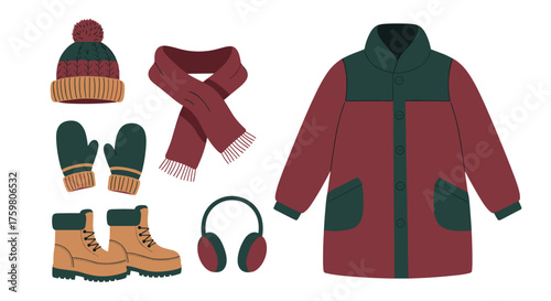 Winter Clothing Collection: Warm Outfit for Cold Weather Adventures, Cozy Accessories Including Coat, Hat, Scarf, Boots, and Earmuffs for Seasonal Activities, Fashionable Apparel for Outdoors, Stylize