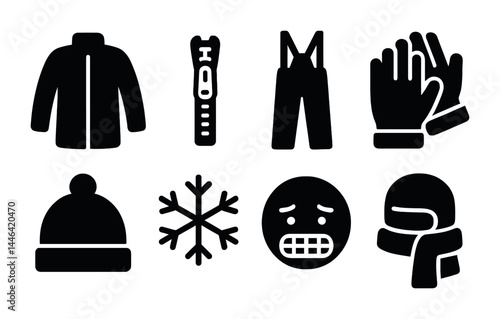 Winter clothing filled icons set – solid style for season essentials, warm apparel, and cold weather gear: jacket, zipper, overalls, gloves, hat, snowflake, chattering teeth, scarf.