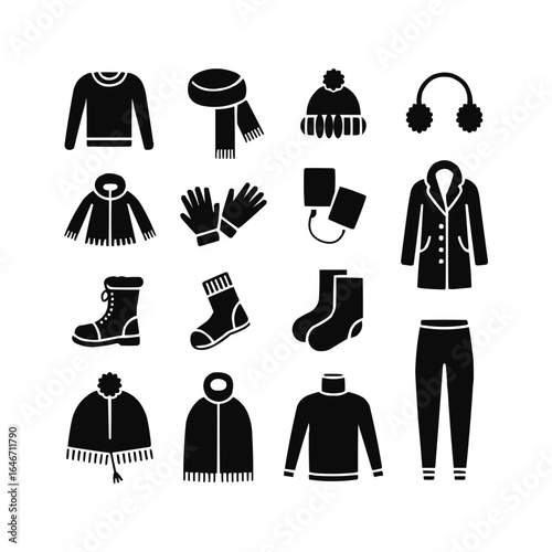 Winter Clothing Icons: Simple Black Silhouette Style, Cold Weather Apparel Graphics