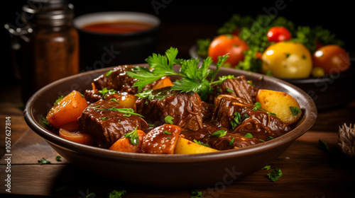 Winter comfort food: Close-up of tender braised beef in rich gravy, garnished with fresh herbs, served with carrots and potatoes on a rustic wooden table