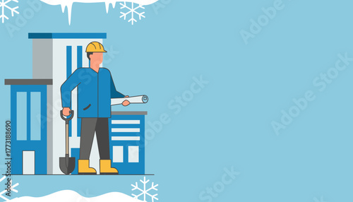 Winter construction Worker in hardhat holds plan and shovel against a snowy city background