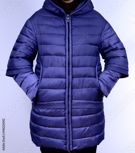 Winter down jacket isolated on a grey background. Fashionable purple coat on model without face. Outerwear.