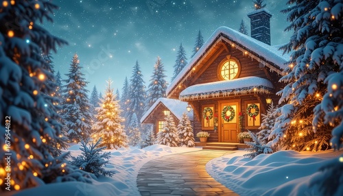 Winter Evening at a Charming Cabin, Nestled Among Snow Covered Evergreen Trees, Aglow with Festive Lights and Holiday Decorations