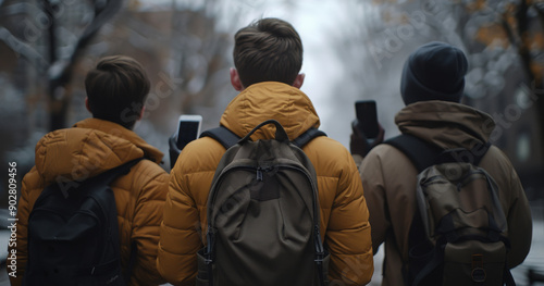 Winter Exploration Journey: Three Friends with Backpacks and Smartphones. Generative ai