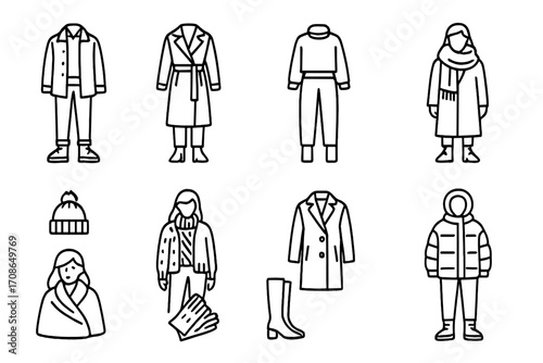 Winter Fashion Icons. Line style icons of stylish winter looks: layered outfit, belted coat, matching set, oversized scarf; knit