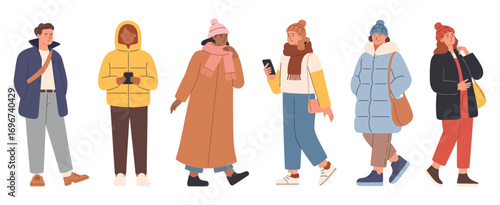 Winter Fashion People Concept with Male and Female Characters Dressed in Warm Seasonal Clothing Standing Isolated on White Background for Cold Weather Style Illustration