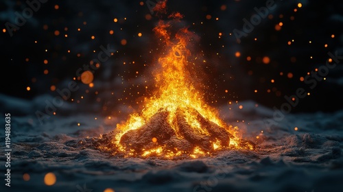 [Winter Festivities winter bonfires warmth] Vibrant Fire with Intricate Design Against Dark Background Rocks Logs Blaze