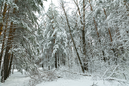 winter forest after a storm (hurricane, snowfall), fallen trees, broken branches