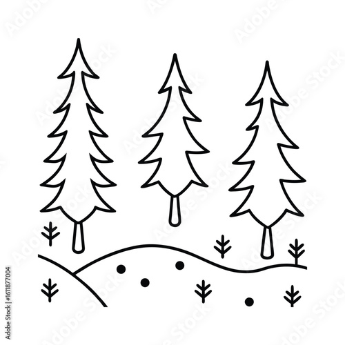 Winter forest filled with Christmas reindeer in snowy holiday setting line art vector illustration
