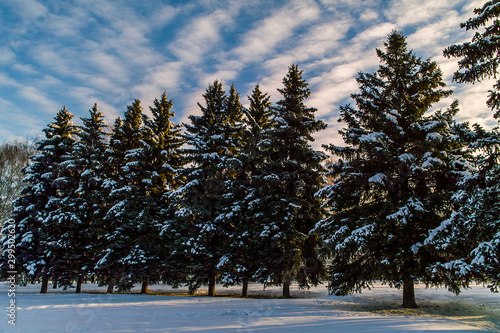 winter forest landscape with christmas trees, snow and blue sky