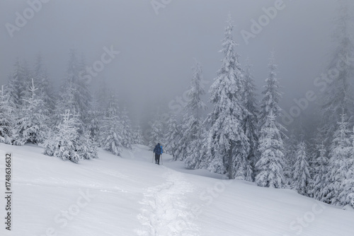 Winter forest. Monochrome landscape. Meadow covered with snow. Pine tree in the snowdrifts. Snowy background. Nature scenery. Winter minimalist photography.