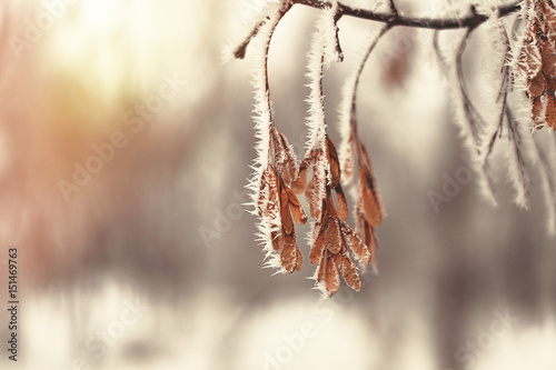 Winter forest pine tree snowflakes falling. Maple branches covered with frost and snow. Blurred winter background with copy space area.