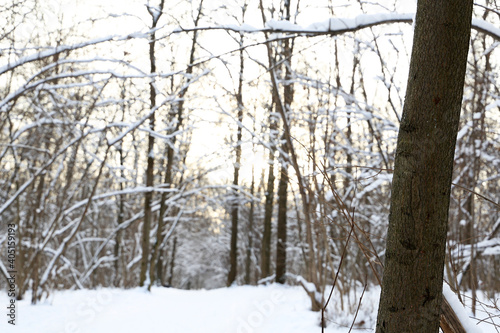 Winter forest, snow covered trees in sunlight. Nature after snowfall, cold weather