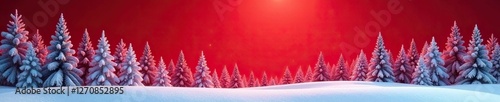 Winter forest with snow-covered trees against a warm red background, holiday, red