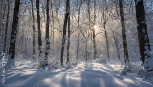 Winter Forest with Sunlight Filtering Through Snow-Covered Trees at Sunrise